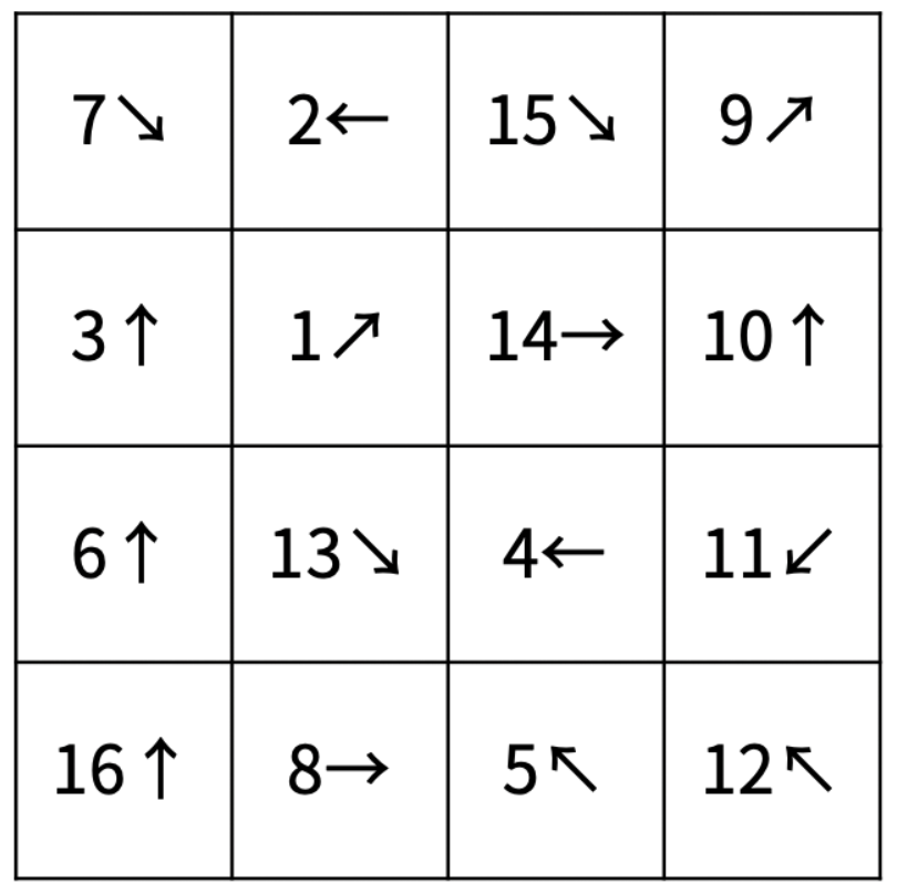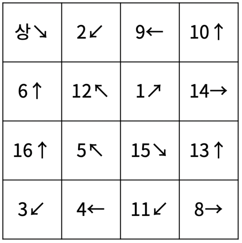 4 x 4 공간 안에 물고기 16마리가 존재하고, 상어가 (0, 0) 지점의 물고기부터 먹기 시작해 먹은 물고기 방향으로 나아가며 먹기를 반복하는 문제입니다.